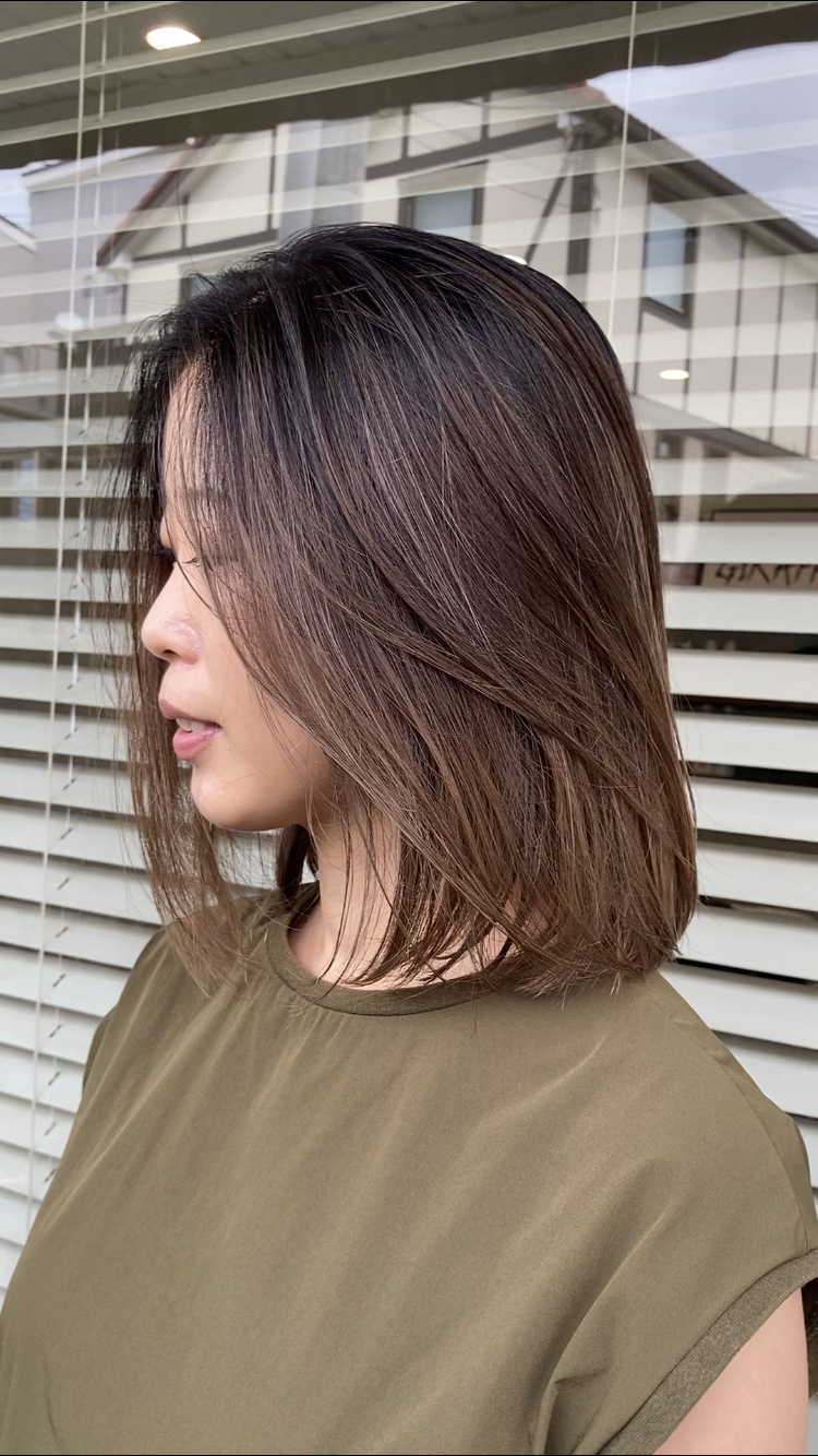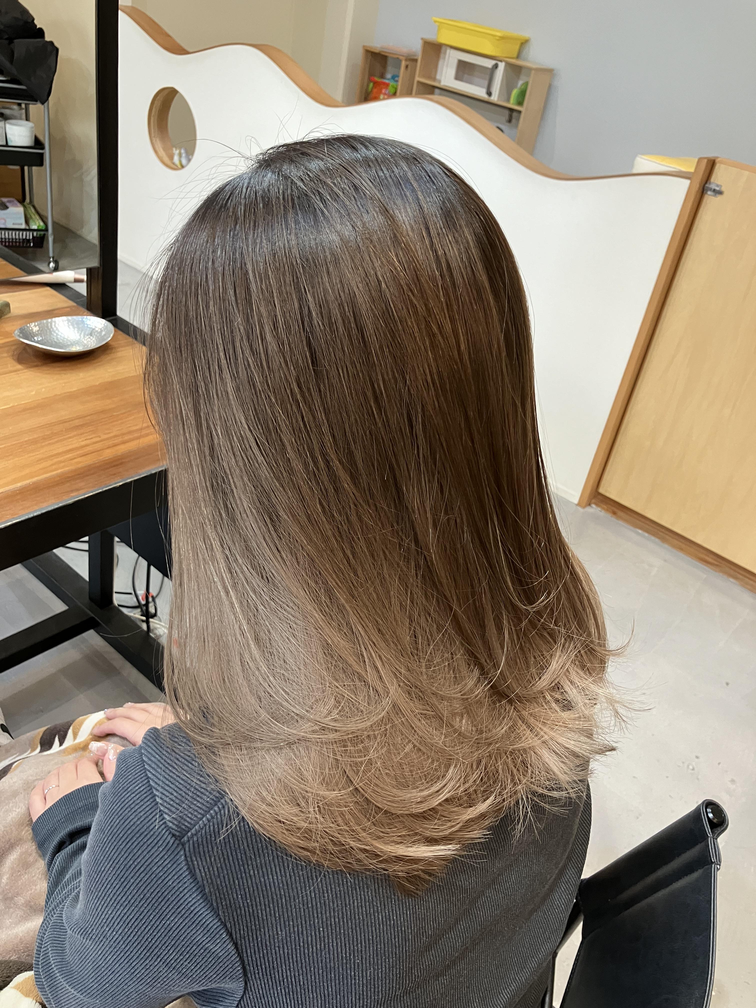 繊細なグラデーションと陰影を効かせたデザインで、立体感と透明感を演出。 2回のブリーチでしっかりと明るさを出しながら、Shadow Rootsで根元を自然に馴染ませ、上品で落ち着いた仕上がり。